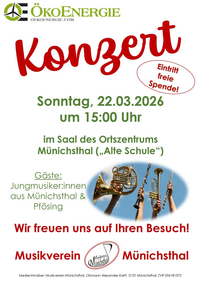 Am Sonntag, den 22.03.2026 findet um 15:00 Uhr das Konzert des Musikvereins Münichsthal im Saal des Ortszentrums statt. Zu hören gibt es ein vielfältiges Konzertprogramm – der Musikverein wird auch heuer wieder von den Jungmusiker:innen aus Münichsthal und Pfösing unterstützt.